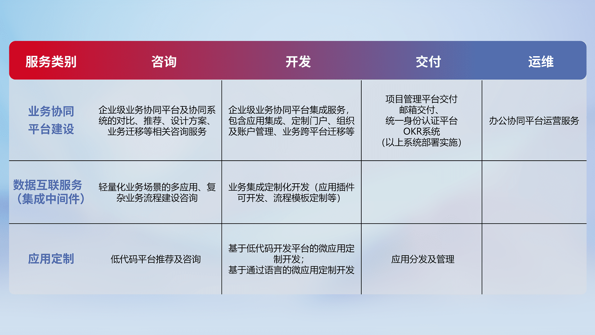 针对钉钉、、、、企微、、、、IDaas等平台级产品提供产品的规划、、、方案、、交付、、、定制化开发等服务,,实现如统一协同办公、、、智能客户服务、、、混合会议管理、、智能数据查询、、、等业务场景,,,,实现数字化转型。。。